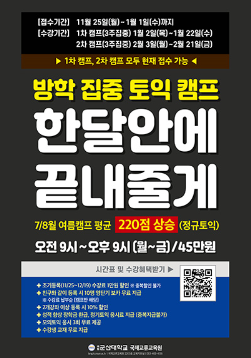 방학 동안 우리 대학은 계절학기 이외에도 다양한 프로그램이 진행된다. 특히, 이는 교내에서 대부분 진행되기에 시간적, 금전적으로도 절약할 수 있다. 그렇다면 우리 대학에서는 어떤 프로그램이 진행될까? 처음으로 소개할 프로그램은 우리 대학 국제교류교육원에서 꾸준히 진행하는 ‘겨울 방학 집중 토익 캠프’이다. 이 프로그램은 3주간 1차와 2차로 나누어져 진행되며 월요일부터 목요일까지는 스파르타 토익 이론과 문제풀이 반이 오전, 오후에 걸쳐 진행되고 매주 금요일은 오전에 토익 캠프에 신청한 학우들이 모의 토익을 보면 오후에 문제 해설을 해주는 방식으로 진행될 예정이다. 1차 토익 캠프는 지난 2일부터 오는 22일까지 진행되며 1월 집중 토익 캠프에 신청하지 못한 학우들은 2차 토익 캠프에 신청할 수 있다. 이는 오는 2일까지 선착순으로 신청을 받으며 2차 캠프 역시 1차 캠프와 마찬가지로 3주간 진행되고 오는 3일부터 21일까지 시행된다. 이 프로그램을 신청하게 되면 영어 특강뿐만 아니라 많은 수강 혜택을 받을 수 있으니 방학 동안 자신의 영어 토익 실력을 올려보고 싶은 학우들은 우리 대학 국제 교류교육원 홈페이지(http://lang.kunsan.ac.kr)에 서 더 자세한 정보에 대해 알아가길 바란다.